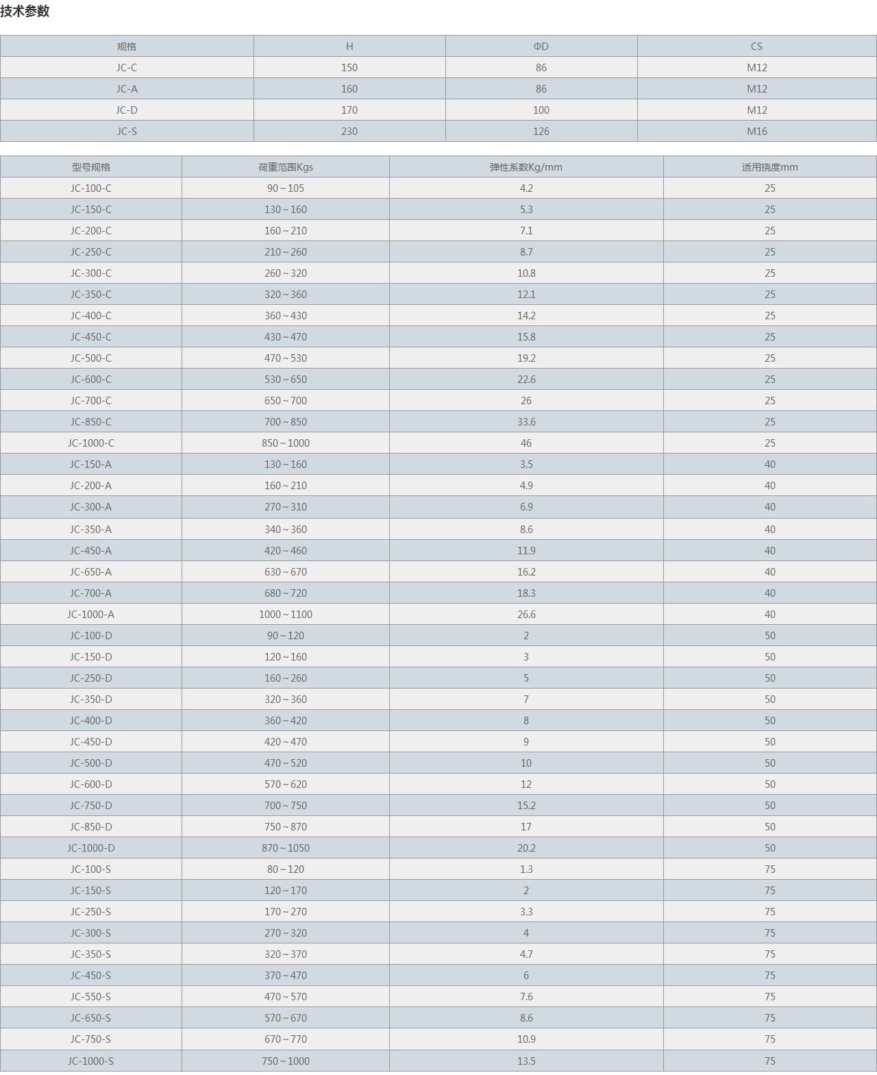 型號(hào)規(guī)格 荷重范圍(Kg) 彈性系數(shù)(Kg/mm) 適用撓度(mm)