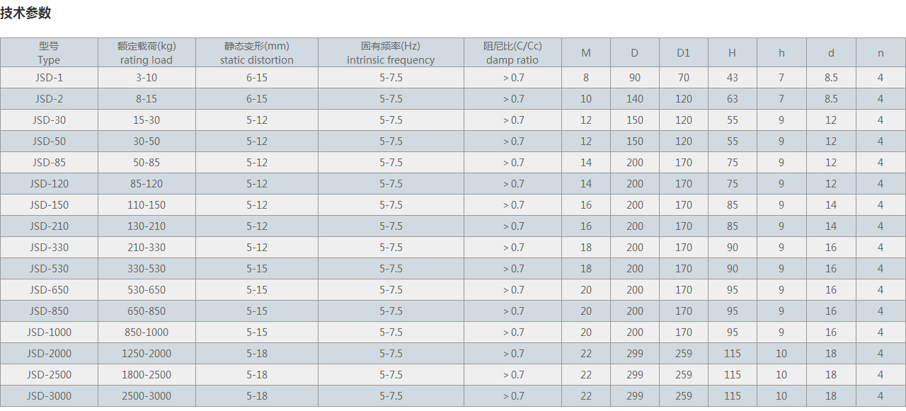 JSD型低頻橡膠隔振器等頻性好,當(dāng)大于額定載荷后,隔振器的固有頻率保持不變;阻尼比大,對(duì)共振峰的抑制能力強(qiáng);結(jié)構(gòu)簡(jiǎn)單、安裝方便,可直接安裝在機(jī)座下,同時(shí)也可用地基螺栓固定安裝,使用安全可靠。十四種規(guī)格,六種外形尺寸,載荷范圍為30N~25000N,耐油、海水、鹽、霧禾口日照等,適用于一25~+117℃溫度范圍。載荷范圍為額定載荷上下50%。