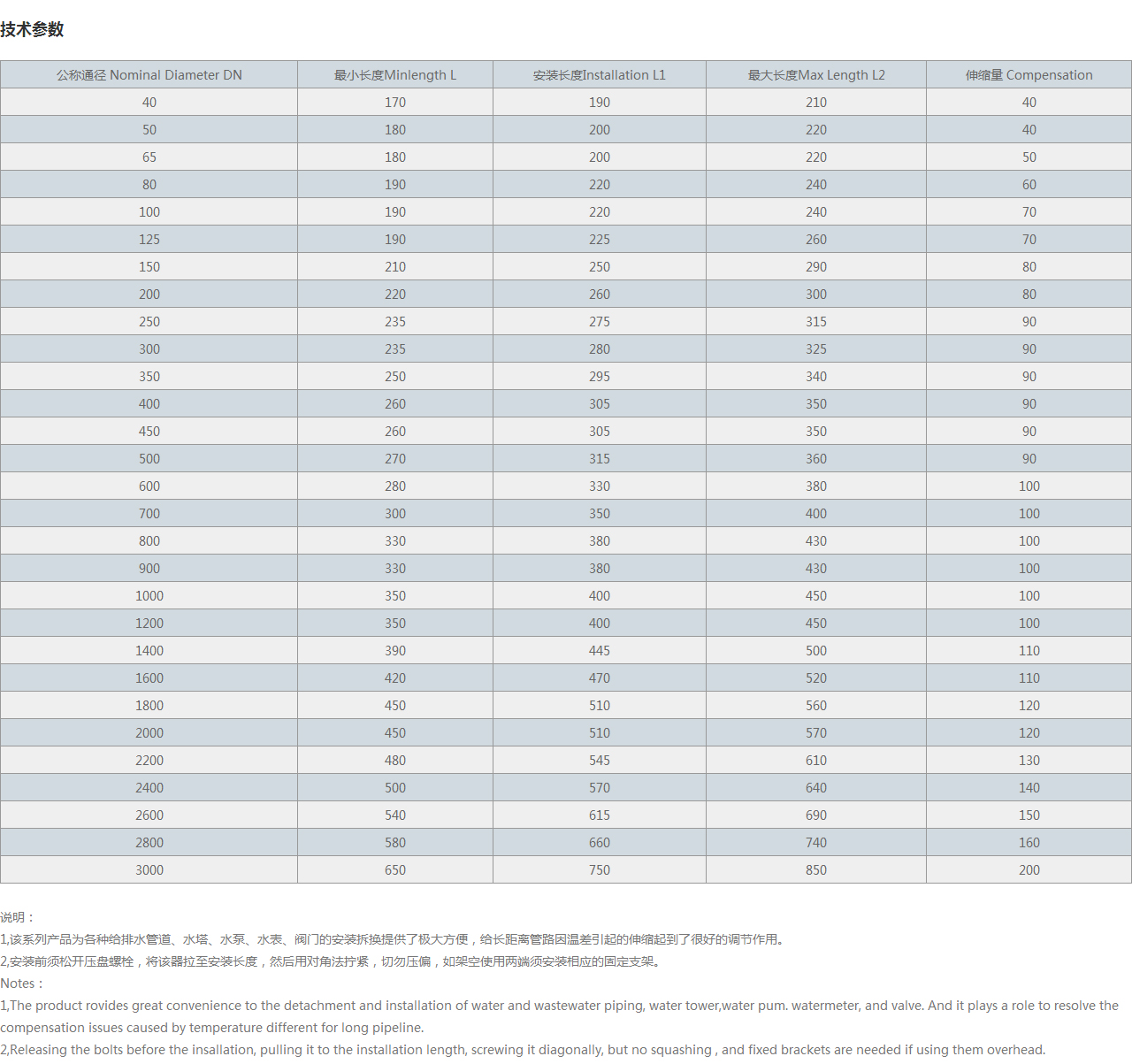 公稱通徑 Nominal Diameter DN 很小長(zhǎng)度Minlength L 安裝長(zhǎng)度Installation L1 很大長(zhǎng)度Max Length L2 伸縮量 Compensation
