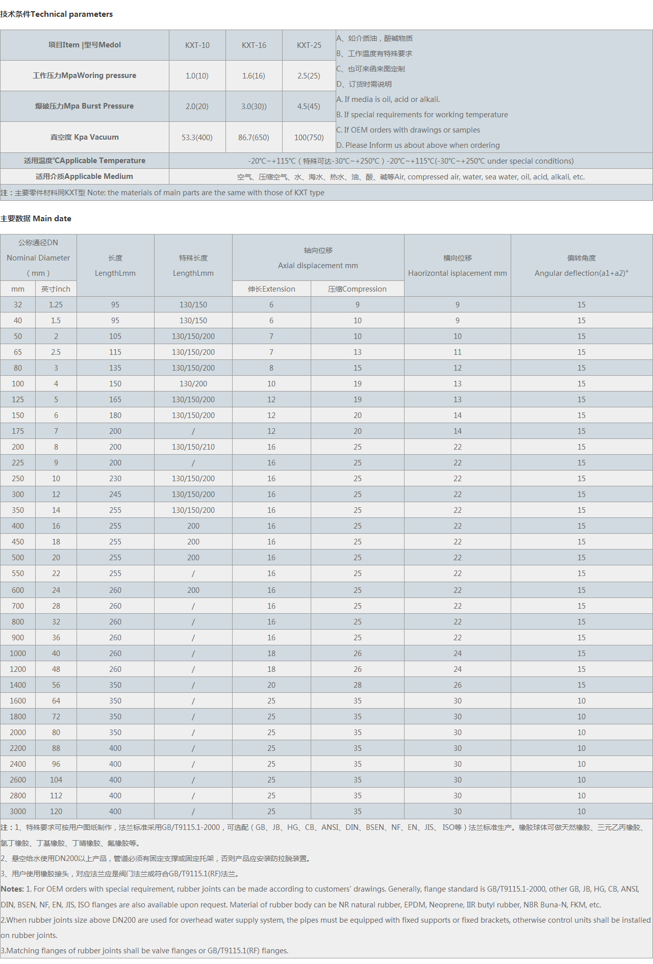 Notes: 1. For OEM orders with special requirement, rubber joints can be made according to customers' drawings. Generally, flange standard is , other GB, JB, HG, CB, ANSI, DIN, BSEN, NF, EN, JIS, flanges are also available upon request. Material of rubber body can be NR natural rubber, EPDM, Neoprene, IIR butyl rubber, NBR Buna-N, FKM, etc.