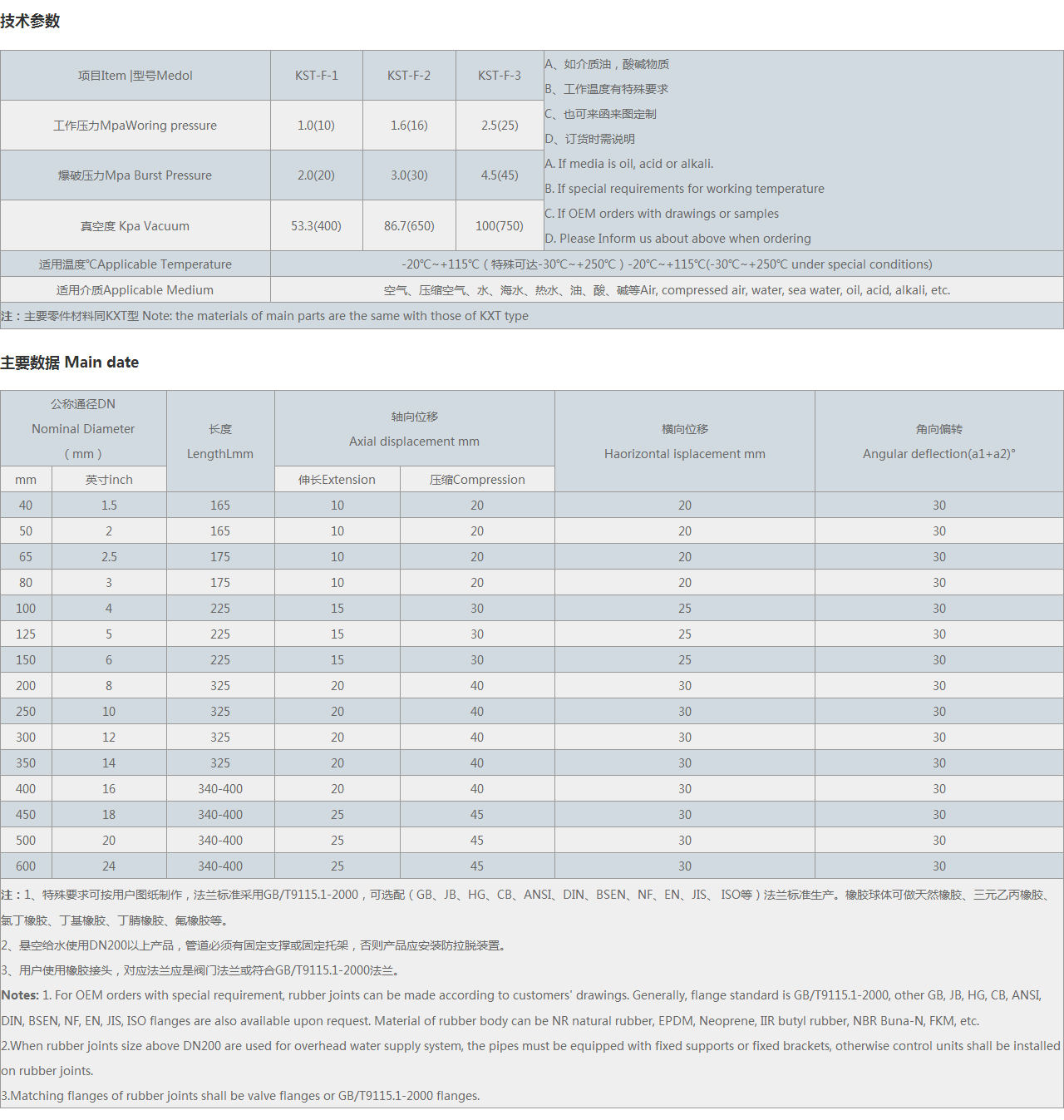 Notes: 1. For OEM orders with special requirement, rubber joints can be made according to customers' drawings. Generally, flange standard is , other GB, JB, HG, CB, ANSI, DIN, BSEN, NF, EN, JIS, flanges are also available upon request. Material of rubber body can be NR natural rubber, EPDM, Neoprene, IIR butyl rubber, NBR Buna-N, FKM, etc.